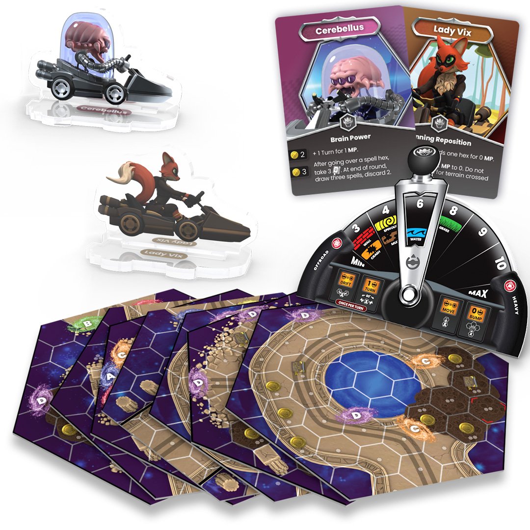 Get lost in the void with the Silver Upgrade Pack for Dungeon Kart! This pack includes 7 double-sided void track tiles, which allows your racer to teleport from one space to the next. This upgrade pack also contains 2 new racers, Cerebellus and Lady Vix, as well as an additional dashboard!